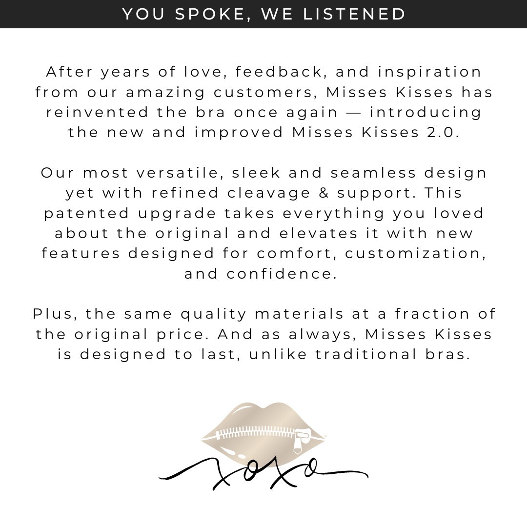 Misses Kisses has reinvented the bra once again and is now introducing 2.0 with new features you’ll Love. The feedback from our customers over the years has been the key inspiration to designing our new Patented version.
